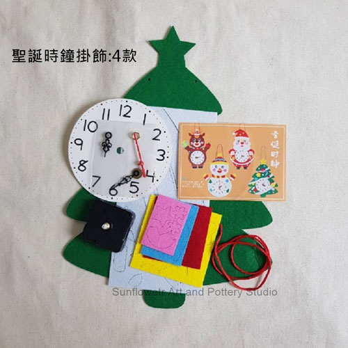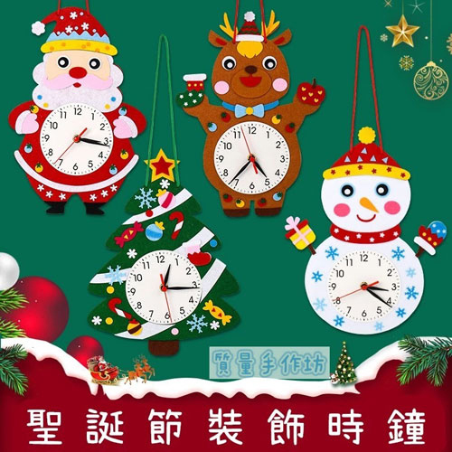 聖誕時鐘掛飾(混合出貨), 每份65元,附機芯 圓形時鐘不織布約直徑: 不織布DIY材料包.美術材料.手作產品加工.織物立體材料.臺灣現貨 附機芯.請需自備3號電池1顆 材料包附說明書.材料包依圖式黏貼→ 不織布配件有背膠.撕下黏上即可
